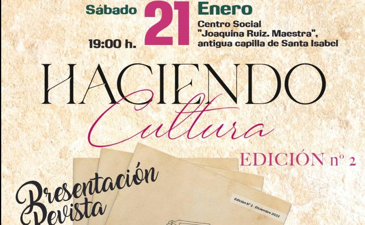 La segunda edición de la revista «Haciendo Cultura» se presentará el próximo sábado 21 de enero en el Centro Social «Joaquina Ruiz» a las 19: ... 00 horas. Una revista que edita anualmente la Asociación de Amigos de la Coral y Folklore Villanovense, cuya publicación se recuperó el pasado año y en ella se recogen las memorias anuales del colectivo así como artículos de investigación y otros de contenido cultural.