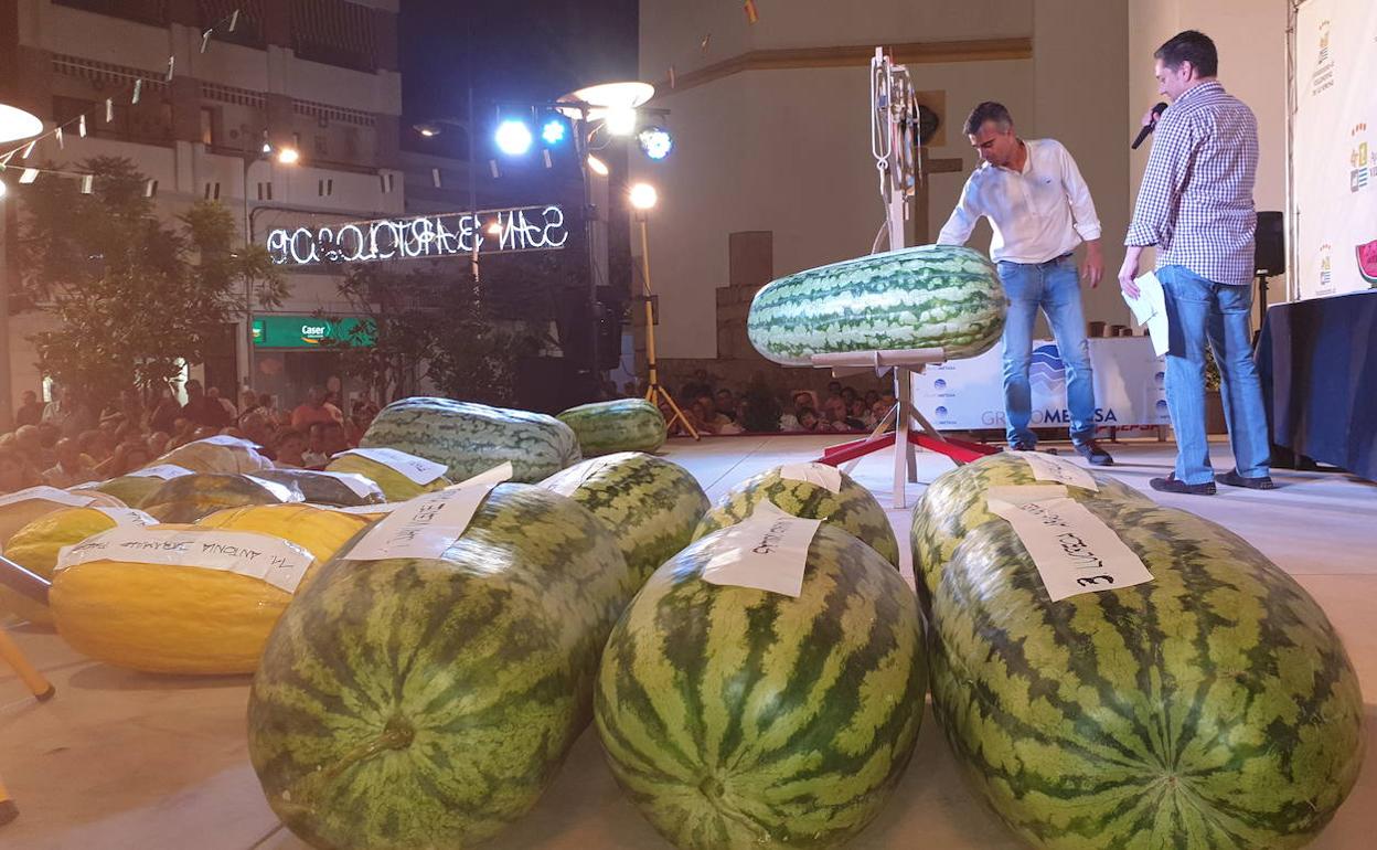 Tras dos años de parón por la pandemia regresan estas fiestas en su 59 edición, conocidas como las de San Bartolo, donde una de sus actividades más concurridas es la del concurso de sandía y melón 'Rufino Pineda Mendoza'. Este año, como novedad, tras ser pesados, contarán con 30 euros de premio aquellos frutos que superen los 30 kilos, en el caso de la sandía, y los 15 kilos, en el caso del melón.