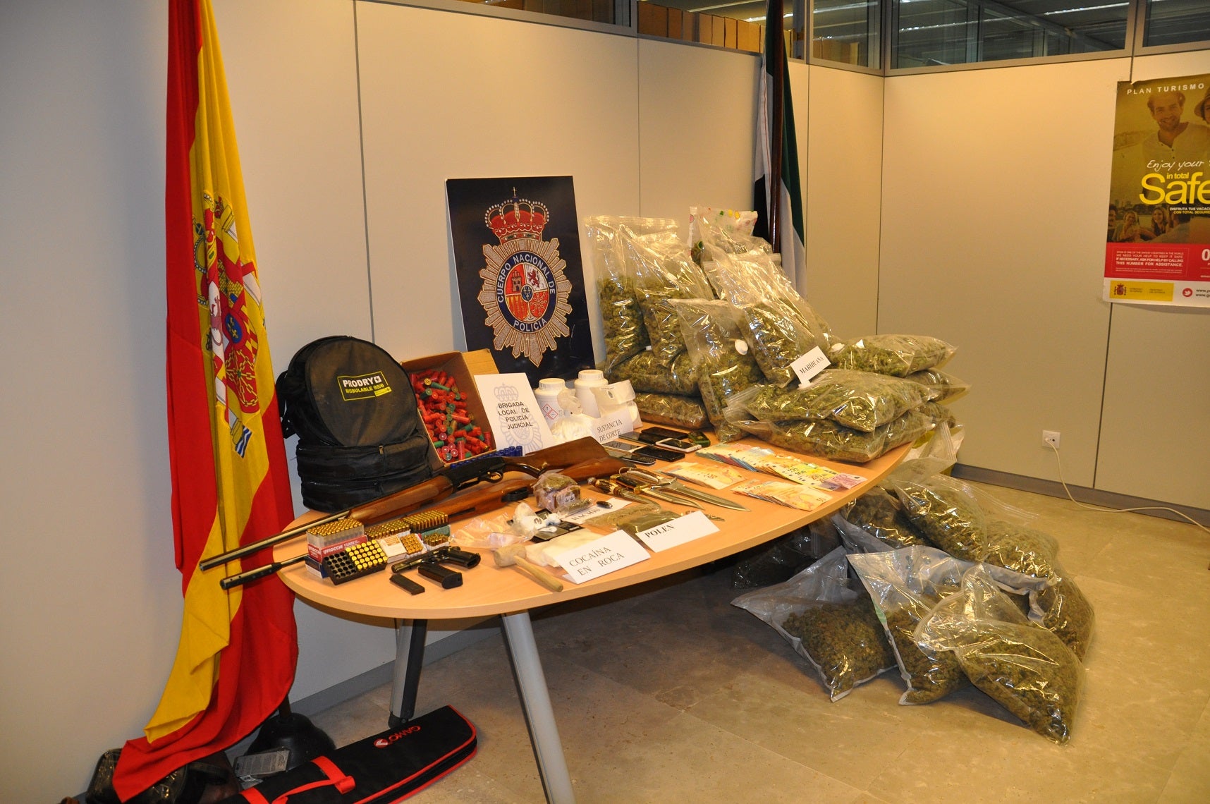 Además de la droga intervenida, los agentes descubrieron 11.382 euros en billetes fraccionados, dos armas de fuego, (pistola calibre 38 y una escopeta de cartucho) con munición y armas blancas, además de numerosos útiles para el cultivo y preparación de las distintas sustancias para su venta.