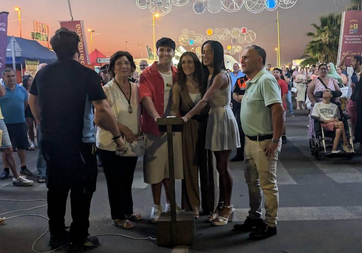 El tradicional encendido corrió anoche a cargo de la deportista villanovense Carla Arce y de Jesús María Pineda, estudiante que ha sacado la mejor nota en la EBAU. Ambos estuvieron acompañados por la alcaldesa, Ana Belén Fernández, y, a continuación, comenzó la música en la caseta municipal que contará con diversas actuaciones cada día.