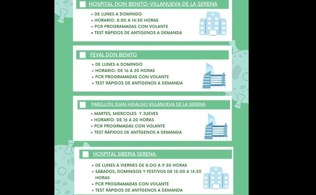 Se realizarán tanto PCR programadas con volante y test rápidos de antígenos a demanda.Según informa la gerencia del Área de Salud Don Benito-Villanueva, a partir del lunes 16 de agosto los puntos y horarios para realizarse las ... pruebas covid son los siguientes:
